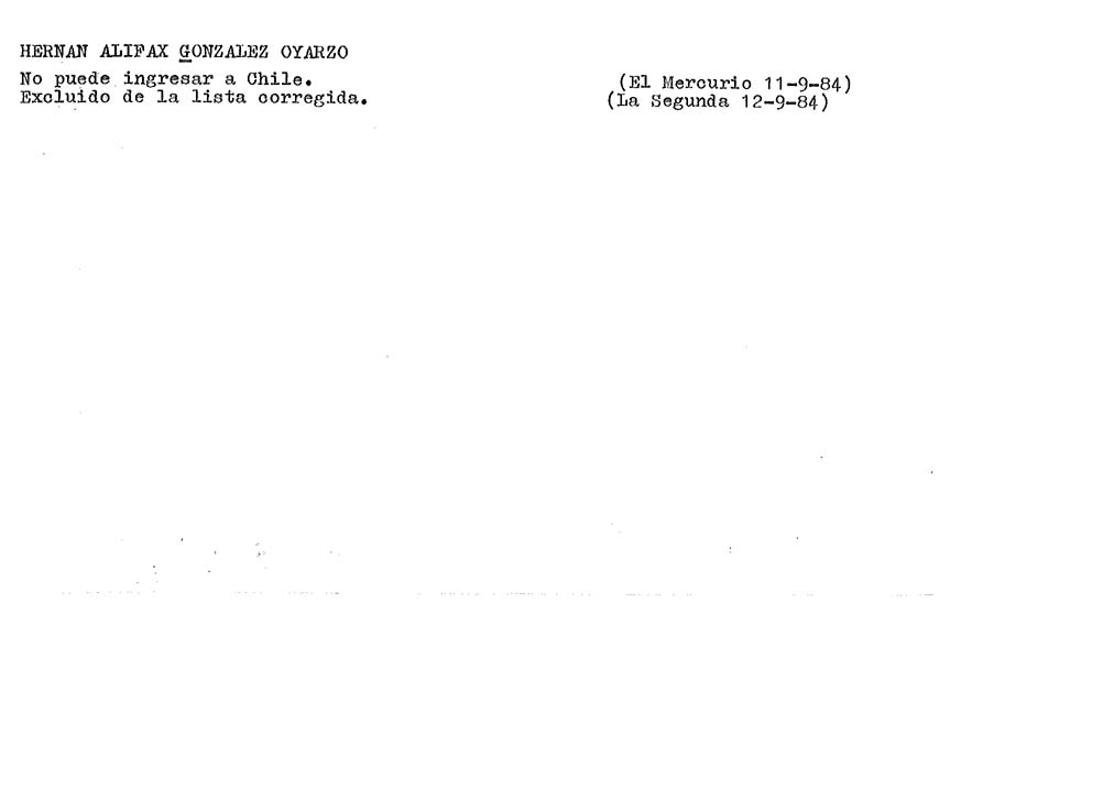 Fichas Chile16/12/2024 GONZALEZ OYARZO HERNAN ALIFAX- Detalles Nombre: GONZALEZ OYARZO HERNAN ALIFAX-Fecha Ficha: 11.09.1984Editor: Dieter MaierPalabras Clave: * Prohibición de ingreso/Einreisesperre * Navegador de entradas Entrada anteriorGONZALEZ OSORIO HERNAN-Entrada siguienteGONZALEZ P- ELIANA- También te puede interesar... Fichas Chile 16/12/2024CARRERA JOSE Fichas Chile 16/12/2024AGUAYO SOBARZO GRACIELA DEL CARMEN Fichas Chile 16/12/2024FIGUEROA O- ROSENDO-