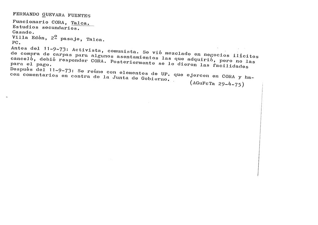 Fichas Chile16/12/2024 GUEVARA FUENTES FERNANDO- Detalles Nombre: GUEVARA FUENTES FERNANDO-Fecha Ficha: 29.04.1975Editor: Dieter MaierLugares: *Talca*Apodos: AGuFcTaPalabras Clave: carpas / ZeltePartidos Politicos: CORA PC Navegador de entradas Entrada anteriorGUEVARA ERNESTO CHE-Entrada siguienteGUEVARA GABRIEL- También te puede interesar... Fichas Chile 16/12/2024RIOSECO VASQUEZ MANUEL (2)- Fichas Chile 16/12/2024FERNANDEZ AGUAYO SERGIO- Fichas Chile 16/12/2024HERREROS VIVAR JESUS-