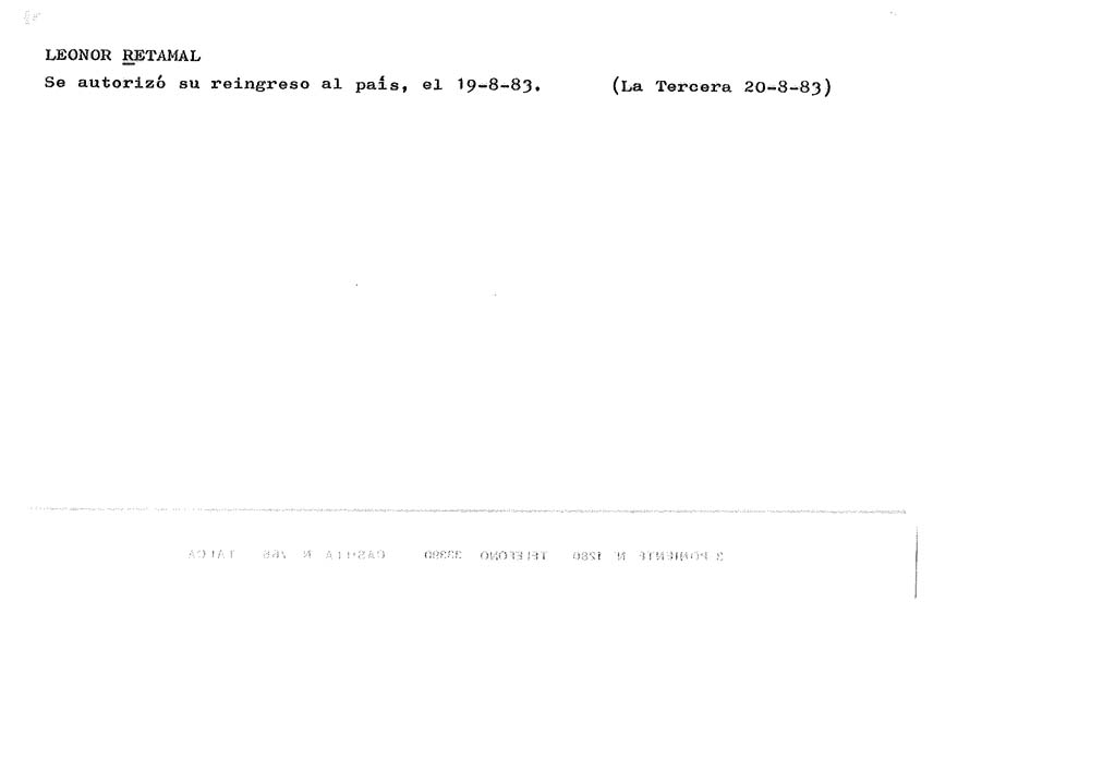 Fichas Chile16/12/2024 RETAMAL LEONOR- Detalles Nombre: RETAMAL LEONOR-Fecha Ficha: 20.08.1983Editor: Luis NavarezPalabras Clave: *autorización de reingreso / Wiedereinreiseerlaubnis 1983* Navegador de entradas Entrada anteriorRETAMAL LARA JOSE-Entrada siguienteRETAMAL LOPEZ SERGIO DEL C– También te puede interesar... Fichas Chile 16/12/2024OVIEDO G- JORGE H– Fichas Chile 16/12/2024CAMPOS LABRA MARTA Fichas Chile 16/12/2024BARAHONA FIGUEROA JOSE RAMON