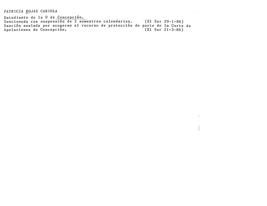 Fichas Chile16/12/2024 ROJAS CARIOLA PATRICIA- Detalles Nombre: ROJAS CARIOLA PATRICIA-Fecha Ficha: 1986Editor: Dieter MaierPalabras Clave: *Suspensión / expulsión / sanción de*Universidad *Concepción*/ aus Universität*suspendiert / sanktioniert** Navegador de entradas Entrada anteriorROJAS CARCAMO HUMBERTO-Entrada siguienteROJAS CARLOS- También te puede interesar... Fichas Chile 16/12/2024MUÑOZ VILLARROEL JORGE- Fichas Chile 16/12/2024GONZALEZ REYES JUAN LUIS (7)- Fichas Chile 16/12/2024HEIREMANS DESPOUY EUGENIO 3-