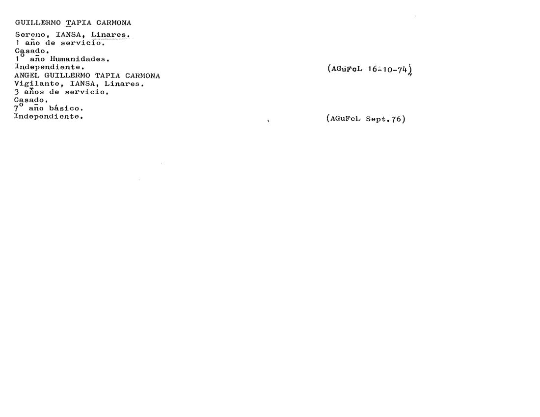 Fichas Chile16/12/2024 TAPIA CARMONA GUILLERMO- Detalles Nombre: TAPIA CARMONA GUILLERMO-Fecha Ficha: 16.10.1974, Sept. 1976Editor: Dieter MaierLugares: *Linares*Apodos: AGuFcLPalabras Clave: *IANSA* Navegador de entradas Entrada anteriorTAPIA CALDERON JORGE-Entrada siguienteTAPIA CARRILLO BLANCA- También te puede interesar... Fichas Chile 16/12/2024BRAVO BRAVO SEBASTIAN DEL C Fichas Chile 16/12/2024ORTEGA- Fichas Chile 16/12/2024ZUNZA E- HILDA-